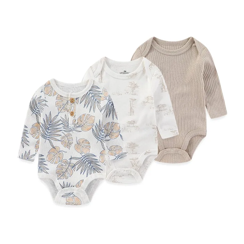 Ce lot réunit trois styles assortis aux tons neutres et apaisants. Le premier body, à imprimé feuillage tropical beige et bleu, apporte une touche de nature et d’évasion. Le second, blanc avec de discrets motifs animaliers, évoque la douceur et la simplicité. Le troisième, uni beige clair, offre une allure intemporelle et chic. Ces teintes naturelles et leurs motifs raffinés s’accordent parfaitement avec toutes les tenues de bébé, pour un look à la fois tendre et élégant.